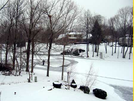| Two days earlier the Morlands and the Nichols had cleared several paths through the snow on the lake and verified that the ice was thick enough to skate safely. John Valassiades helped with the shovelling for the big event and everyone contributed to the overall success of the evening. |